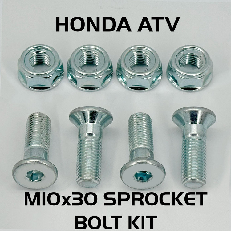 M10x30 Sprocket Bolt Set for: ALL Honda TRX450R, TRX450ER, & SPORTRAX 450 ATV models. Made of high-quality steel and a tough zinc finish, these bolts ensure a secure fit and reliable performance. The kit is composed of SPECBOLT 10.9 GRADE sprocket bolts that meet or exceed OEM specifications, giving you peace of mind while riding. Manufactured in Taiwan, and assembled in USA, this sprocket bolt kit offers convenience, durability, and strength, and are suitable for off-road and racing applications. Get your hands on these top-quality sprocket bolts, and keep your Honda ATV maintained with top quality parts from a trusted seller you know. Sprocket Bolts are direct replacements for OEM # 90114-HP1-600 & 90114-HP1-000, and take a 6mm Allen wrench Fuji Lock Nuts (U nut) are direct replacements for OEM # 90304-GE8-003 and use a 17MM wrench