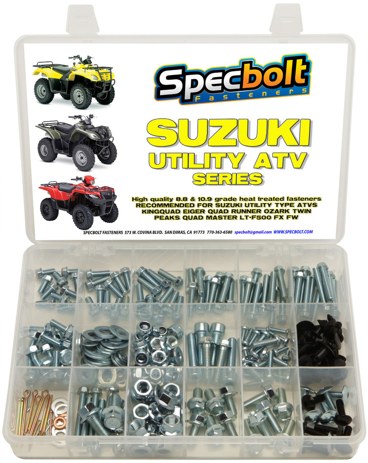 Specbolt's Suzuki Utility ATV kits fit all SPORT UTILITY ATVS For all Suzuki utility and 4x4 ATVs including all EIGER 376 & 400 cc, KINGQUAD 280 300 400 450 695 700 & 750 cc, LT-V700, TWIN PEAKS & LT-F500 FX FW 493cc, OZARK 246 & 250 cc, QUAD RUNNER 158 160 229 230 246 250 493 & 500 cc, QUAD MASTER 493 & 500 cc, 4X4 AND 2 WHEEL DRIVE ATVS utility and 4x4 ATV models. Designed to help you maintain and restore your Suzuki Utility ATV with OEM type fasteners. Our OEM style bolts are bolts match the original bolts that came on your Suzuki ATV from the factory. Our OEM style bolts are exact factory sizes with the same head style and strength ratings and meet or exceed the factory specs. Our bolts are heat treated and zinc plated for strength, corrosion resistance, and designed to last the life of your ATV. They are stronger and lighter than the stainless steel bolts as well. Included in this 250pc kit will be bolts to mount your fenders and plastic body (including a generous supply of black nylon push rivets and black truss head body screws), plastics, mud flaps, fuel tank, engine case bolts up to 40mm, full set of lugnuts, carburetor bowl screws, intake bolts, exhaust bolts, radiator bolts, skid plate bolts, bumper/grab bar bolts, brake master cylinder lid screws, fasteners for controls, and more. Even though it is not a full on restoration kit, It will give you much of what you need to rebuild the entire machine. Suspension bolts and long motor mount bolts are not included. If you would like to ask a question feel free to email us at specbolt@gmail.com or give a call at 770-363-6580.