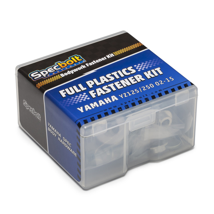 This is a complete kit that will fit 2002-2015 YZ125/YZ250. include everything that you need to replace all your Yamaha YZ plastics and or body panel fasteners. Includes all the hard to get Oval CNC aluminum bushings. Includes an individual OEM Match fastener assortment for each of the following: Front Fender & Number Plate Fork Guards Radiator Shrouds Rear fender Seat & Side Panels. Everything is bagged and labeled so that you know where everything goes.
